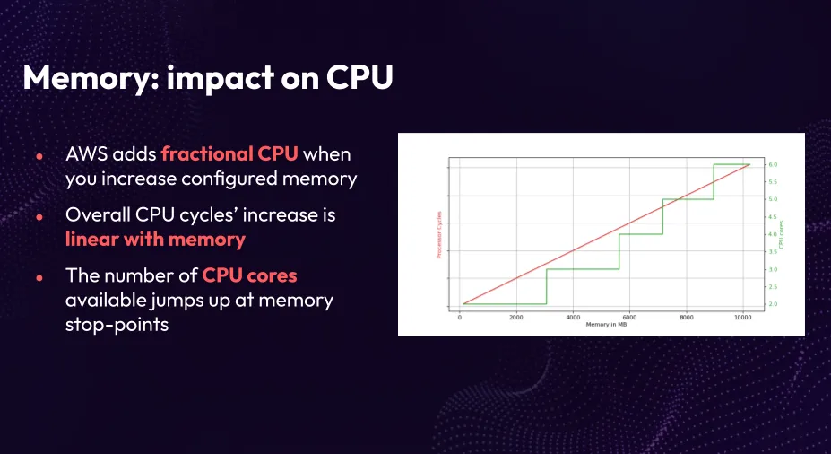 What you see in the relationship between memory and CPU is linear. You increase this one, the other one increases. It's a straight line that’s why it’s very easy to understand. There are very preset points in this graph, where the number of cores that's available to your Lambda jumps from two to three and three to four and so on. This is well documented. There's a known behavior and something that AWS lets you take advantage of. As a developer who's writing Lambdas, this is something that you have to pay a little bit more attention to. Make sure the Lambda that you run is able to take advantage of all the cores. Select your choice of language that you use for the Lambda, choice of libraries and make sure that they can take advantage of all the CPU cores and that all these memories set points as you increase the configuration of memory. Memory and CPU are directly related- increase one, you increase the others.
