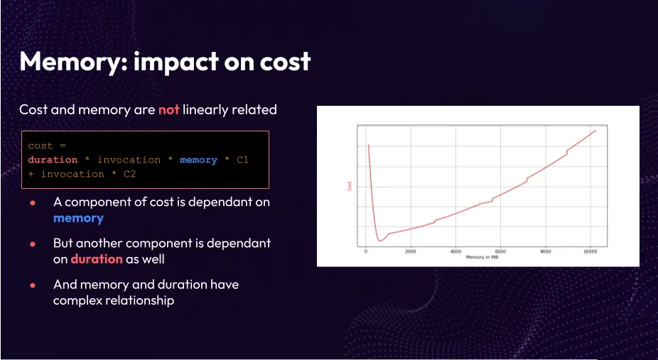 What we observe from the accompanying graph is that as memory increases, the cost initially decreases before eventually rising. This indicates a complex relationship between memory and cost. Why does this happen? As previously mentioned, part of the cost is dependent on memory, while the other part is influenced by the duration. As we have established, the relationship between memory and duration is not linear but rather complex. This compound effect contributes to the non-linear relationship between memory and cost.