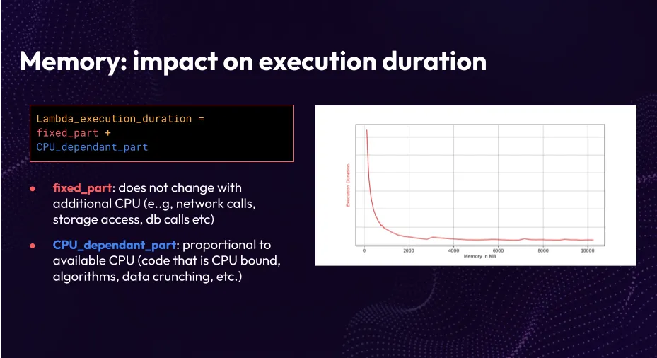 Plotting the relationship between memory and execution duration reveals a non-linear codependency. It's important to note that adding more CPU power does not necessarily lead to a proportional increase in performance. There comes a point of diminishing returns, which is captured by the curve representing this relationship. As memory is increased, it indirectly affects CPU utilization, contributing to the observed distribution. The key takeaway is the existence of a non-linear connection between memory and duration, with memory also indirectly impacting CPU performance.