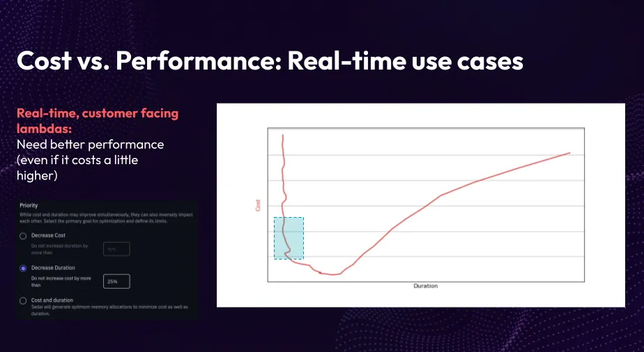Within Sedai, we provide a setting on the left side where customers can choose to increase performance and decrease duration, even if it incurs slightly higher costs. For instance, customers may indicate that they are willing to spend 25% more on a particular Lambda as long as the performance is improved. The shaded part of the chart represents this scenario. As you can observe, the duration trend moves towards the left, indicating faster execution, while customers are willing to accept some additional cost. However, they don't want to reach the upper region of the chart, as the difference in performance between that point and the lower region is not significant, despite the steep increase in cost. The goal is to stay within the bottom part of the graph.