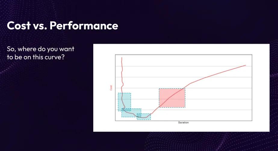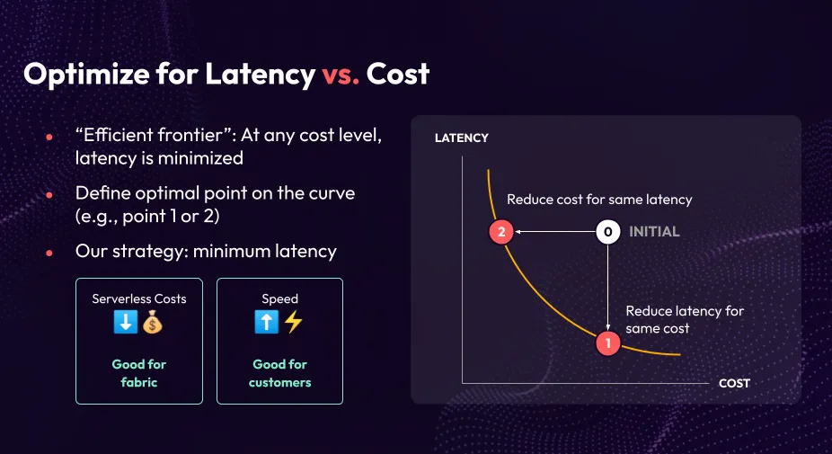 The provided image illustrates the trade-off between latency and cost optimization. Finding the optimal point on the curve, whether for cost or latency, is the objective. While fabric prioritizes lower costs, customer preferences lean towards speed and performance. Achieving a balance between cost and speed becomes crucial, and fabric can easily configure this balance by determining the desired level of improvement and the corresponding cost they are willing to invest, ultimately achieving the desired outcome.