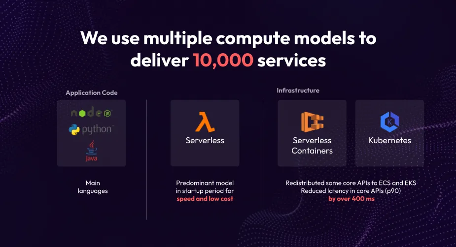 To establish this infrastructure and the underlying systems, they have employed over 10,000 services, with a significant portion of them being built using serverless architecture on Lambdas. These services are implemented in a variety of languages such as Node.js, Python, and Java. Additionally, there is a blend of Kubernetes and serverless containers used to fully define the backend environment.