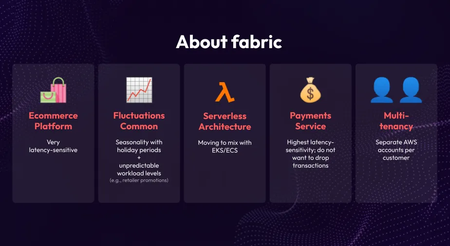 fabric is an e-commerce platform that caters to various e-commerce vendors, providing them with the infrastructure and tools to set up their online stores. As an e-commerce platform, fabric understands the criticality of minimizing latency, as it directly impacts user experience and customer satisfaction. In the online shopping world, users are quick to abandon a website or checkout process if it is too slow or cumbersome. The e-commerce industry is also subject to seasonal fluctuations and event-driven promotions, which further necessitates a responsive and high-performing system. Fabric has built its platform primarily using a serverless architecture, leveraging Lambdas to easily scale and manage their infrastructure. However, to optimize performance, cost, and other internal objectives, certain workloads have been transitioned to EKS and ECS. Among the various services offered by fabric, the payment service is particularly latency-sensitive, as ensuring seamless and secure payment transactions is of utmost importance to both fabric and its customers. Moreover, fabric operates on a multi-tenant environment, with each customer onboarded through separate AWS accounts, introducing complexity in managing multiple customers simultaneously.