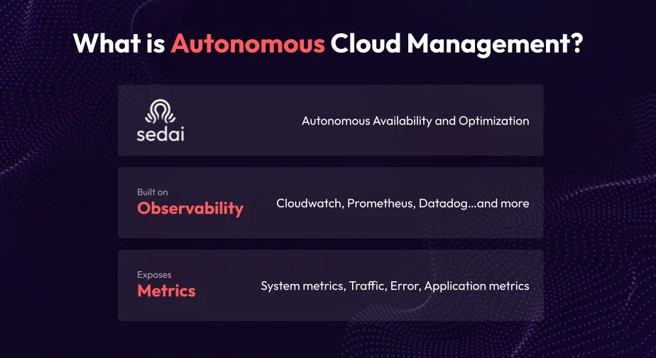 Autonomous Cloud Management, exemplified by Sedai, is a platform that autonomously oversees and optimizes your cloud infrastructure, applications, and microservices. By leveraging observability platforms like Cloudwatch, Prometheus, and Datadog, Sedai utilizes metrics, including system metrics, application metrics, topology information, and tickets, to ensure availability and optimization.