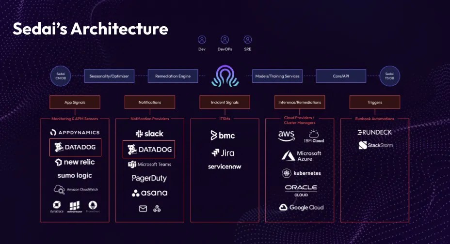 Sedai's architecture incorporates APMs, monitoring systems (e.g., Datadog, New Relic), and notification providers (e.g., Slack, PagerDuty) on the left side. It integrates with ticketing systems (e.g., BMC, Jira, ServiceNow), cloud providers, and automation systems (e.g., Stack Stone, Rundeck). This setup enables Sedai to gather detailed information, push/pull notifications, and utilize data from various sources, including cloud providers. The architecture reflects the scale and complexity of the challenges Sedai typically handles.