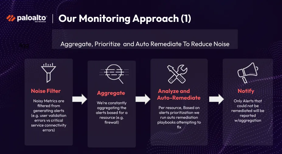 The journey of refining their monitoring approach is an ongoing process for the team. Despite initially identifying key issues related to customer experience, they continue to discover new metrics and potential sources of noise. To address this, they employ aggregation and automated remediation while constantly measuring the effectiveness of auto-remediation through metrics such as MTTR (Mean Time to Resolution), noise reduction, and manual analysis of missed detections. This input allows them to prioritize and revisit metrics, ensuring that their monitoring solution evolves to address both noise and missing elements effectively.
