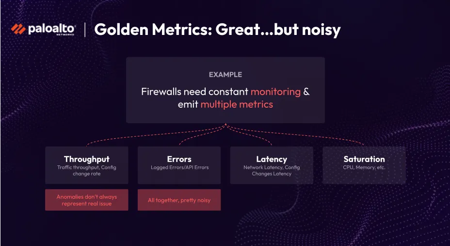 To monitor the system effectively, focus is placed on key metrics known as "golden metrics." In the case of firewalls, four categories of golden metrics are considered. These include throughput metrics, which encompass configuration changes and actual traffic throughput. Error metrics track API errors and logged errors in firewall logs. Latency metrics cover security processing, network latency, and API/config latency. Saturation metrics include CPU and memory usage. While around 100 metrics are emitted by the firewalls, setting alerts based on thresholds for all of them can lead to excessive noise.