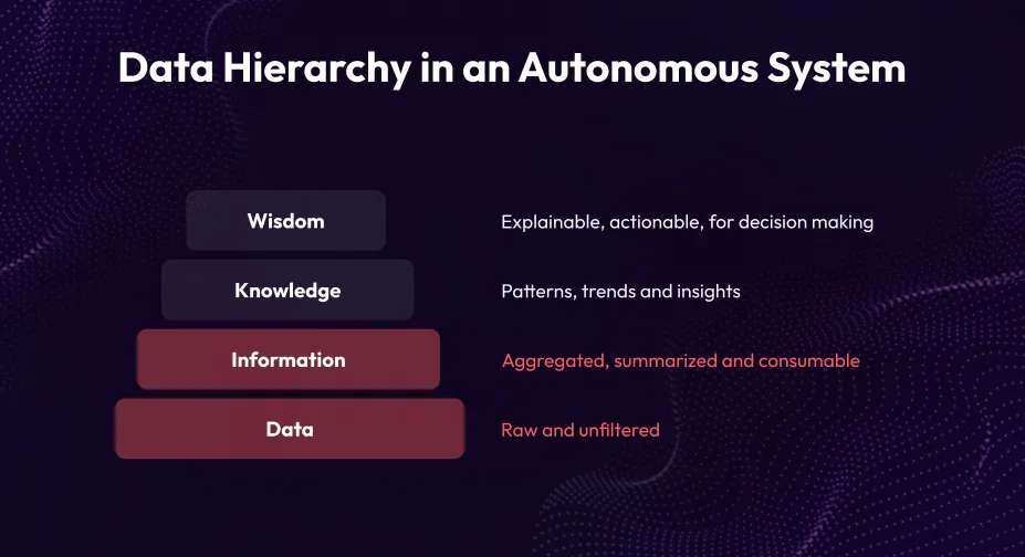 In the data hierarchy of an autonomous system, raw unfiltered data is collected from various monitoring systems. This data is then aggregated and summarized to make it more consumable and meaningful. The next level involves extracting patterns, trends, and insights, providing knowledge from the data. With accumulated knowledge, decisions can be made, changes can be implemented, and actions can be taken. This is where metrics prioritization and decision-making occur within the hierarchy.