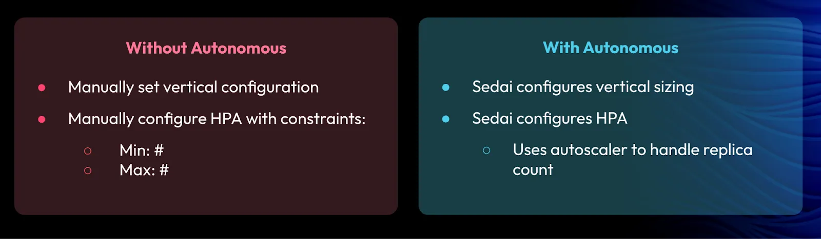 But autoscalers can bring major efficiencies. In the autoscaler model, the number of replicas is determined at the runtime, and not defined in IaC. With autonomous systems, the situation is similar. Workload attributes that can be set more efficiently in runtime are left to the autonomous system.