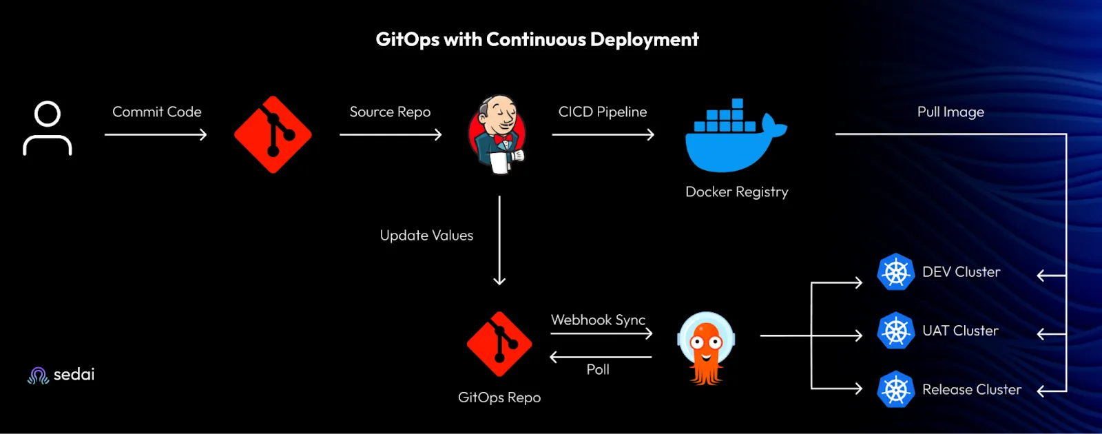 Let‘s look at an example GitOps workflow which uses CI/CD to ship a software release into a containerized application.