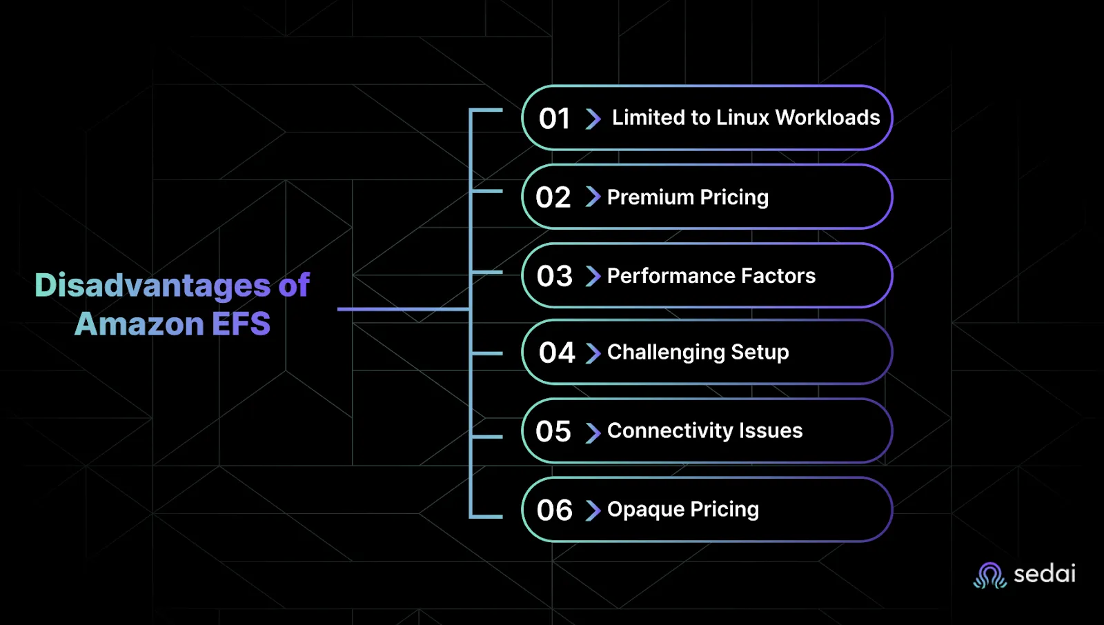 While Amazon EFS offers many benefits, it’s important to understand its limitations before making it a core part of your cloud storage strategy. Here are some key drawbacks and challenges that can impact your experience: