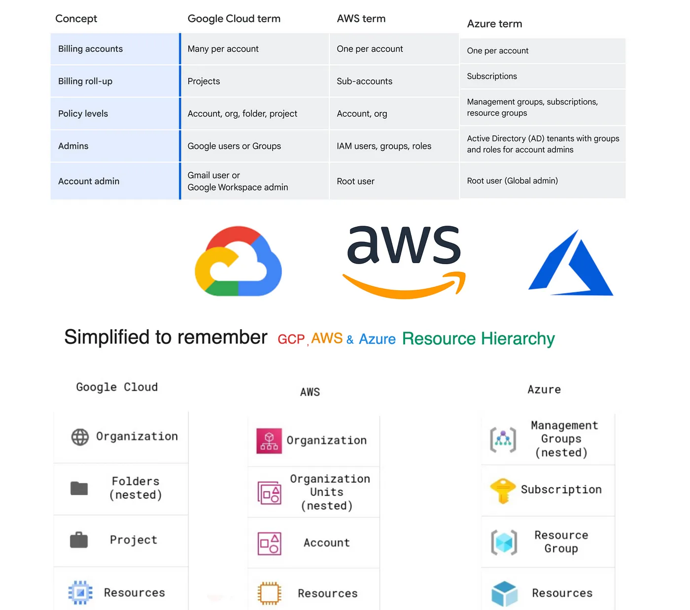 Source: GCP, AWS & Azure Cloud Resource Hierarchies and Billing Management simplified guide