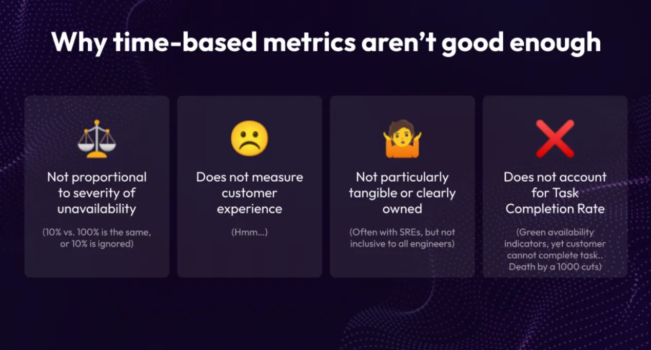 Availability doesn't always reflect the severity of an incident accurately, nor does it measure the customer experience. It also lacks clear ownership, as different teams may be responsible for implementing changes. Additionally, availability doesn't capture task completion rate, which is crucial for assessing if customers can easily accomplish their goals on a webpage.