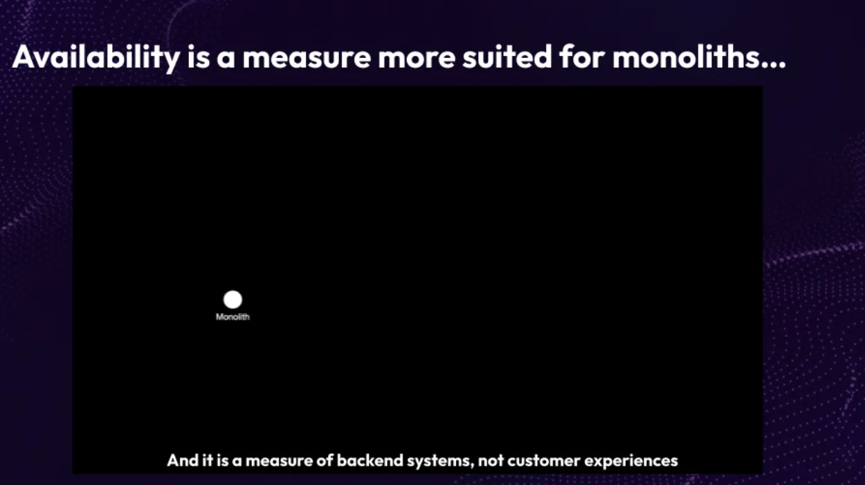 The traditional metric of availability, which measures how often a system is up and running, was designed for an era when monolithic systems were dominant. Monolithic systems are a type of software architecture where everything is interconnected and dependent on a single machine. Back then, availability was simply determined by whether that machine or its network connection was functioning.