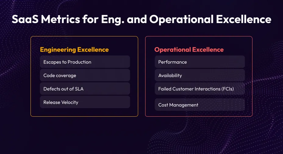 To track these aspects, certain metrics are commonly used. For engineering excellence, metrics like escapes to production, code coverage, defects out of SLA, and release velocity are important. These metrics assess the quality, test coverage, adherence to service level agreements, and speed of software deployment.
