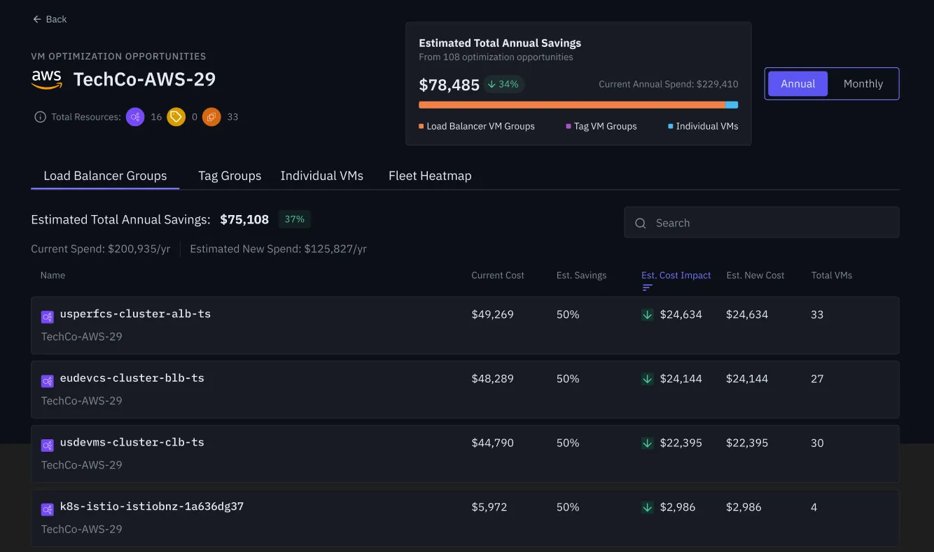 Early adopters have seen significant improvements in both performance and cost efficiency. For instance, a technology company has identified over $75k of annual savings, a 34% saving, in its dev / test environments through rightsizing using Sedai’s optimization: