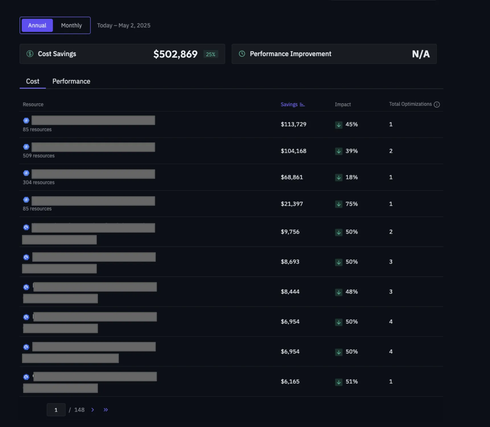 Optimization efforts driven by rightsizing resulted in $500,000 of cloud spend savings on an annual run rate basis. These extended across over 1,400 Kubernetes resources. Below is the latest view of the Sedai dashboard for the account showing the total savings and some of the individual services (there are over 100 pages listing all the services!).