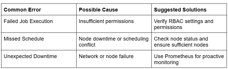 Common issues include failed jobs, missed schedules, and unexpected downtimes. To troubleshoot, review Kubernetes logs and use monitoring tools like Prometheus to diagnose and resolve errors effectively.