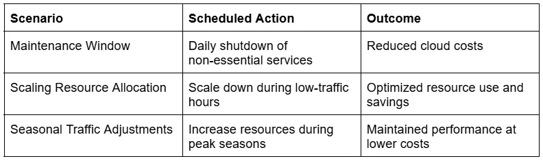 Scheduled shutdowns allow teams to create maintenance windows during off-peak hours, reducing costs without affecting end users. By shutting down non-essential services or environments (like staging or development) during times when they’re not actively in use, organizations can achieve substantial savings.