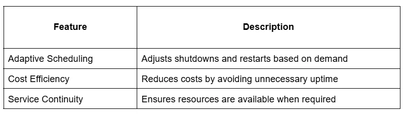 This ensures that critical workflows are uninterrupted while optimizing resource usage. Moreover, reducing the number of active resources during non-essential hours leads to a more efficient utilization of the infrastructure, improving overall operational workflows.