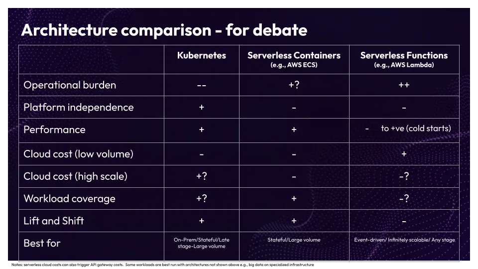 The panelists explored a comparison chart that assessed the operational burden of Kubernetes versus Serverless functions. While there is some disagreement on the specific weights assigned to each factor, the panelists generally agree that minimizing operational burden is crucial. They highlighted the importance of considering the value-to-cost ratio, with operational burden taking precedence over cloud cost. The consensus is that technologies like AWS Lambda provide significant value by reducing operational burden, particularly for startups and ventures focused on product-market fit. As businesses scale, Kubernetes becomes a more viable choice due to increased complexity and the need for dedicated teams to manage workloads.