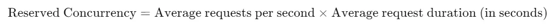 For instance, if your Lambda function receives an average of 100 requests per second, with each request taking 0.5 seconds to complete, the required reserved concurrency would be: