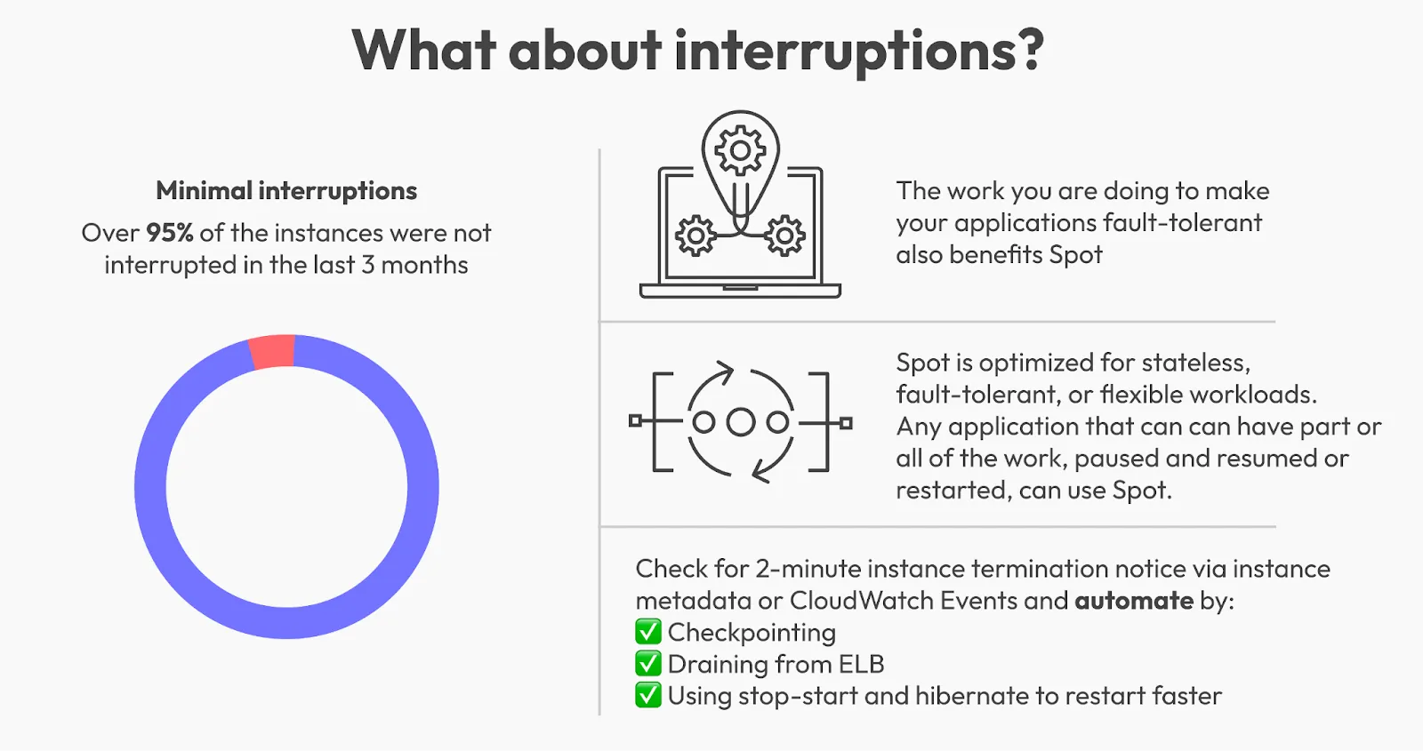 All these price benefits come with a catch. Spot instances can be interrupted to fulfill rising on-demand requests. The instance will be given a 2 minute notice, after which, it is terminated. Fault-tolerant or stateless workloads hence work best with spot instances, as an interruption will have little to no impact on it.