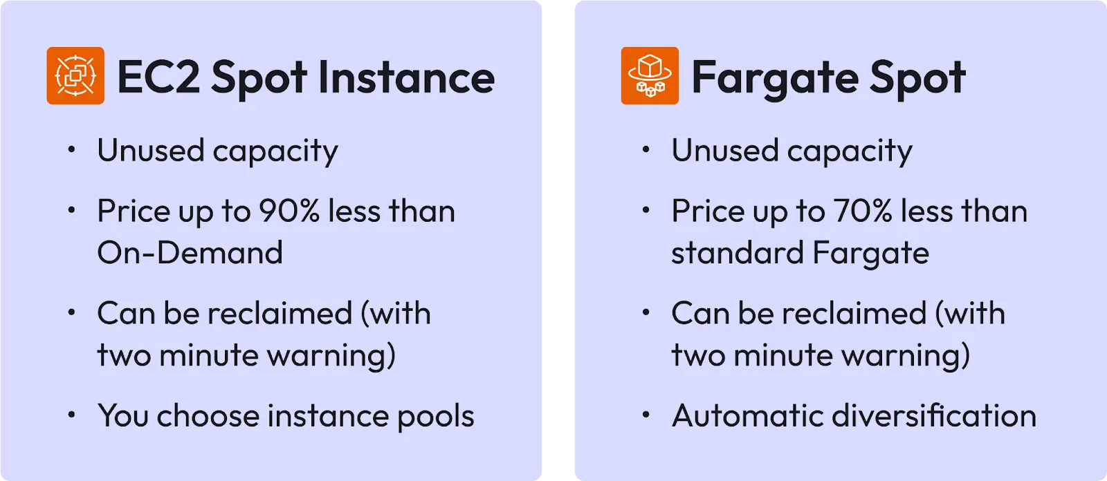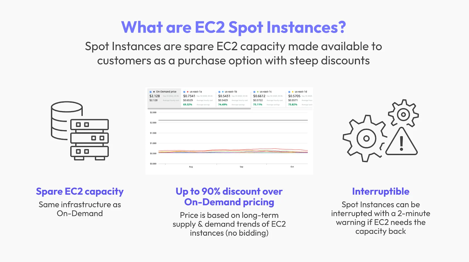 Spot instances constitute the spare compute capacity in AWS which are available at steep discounts of up to 90% compared to on-demand prices. These are best suited for stateless or fault-tolerant workloads as AWS can claim these instances back to serve rising demand.