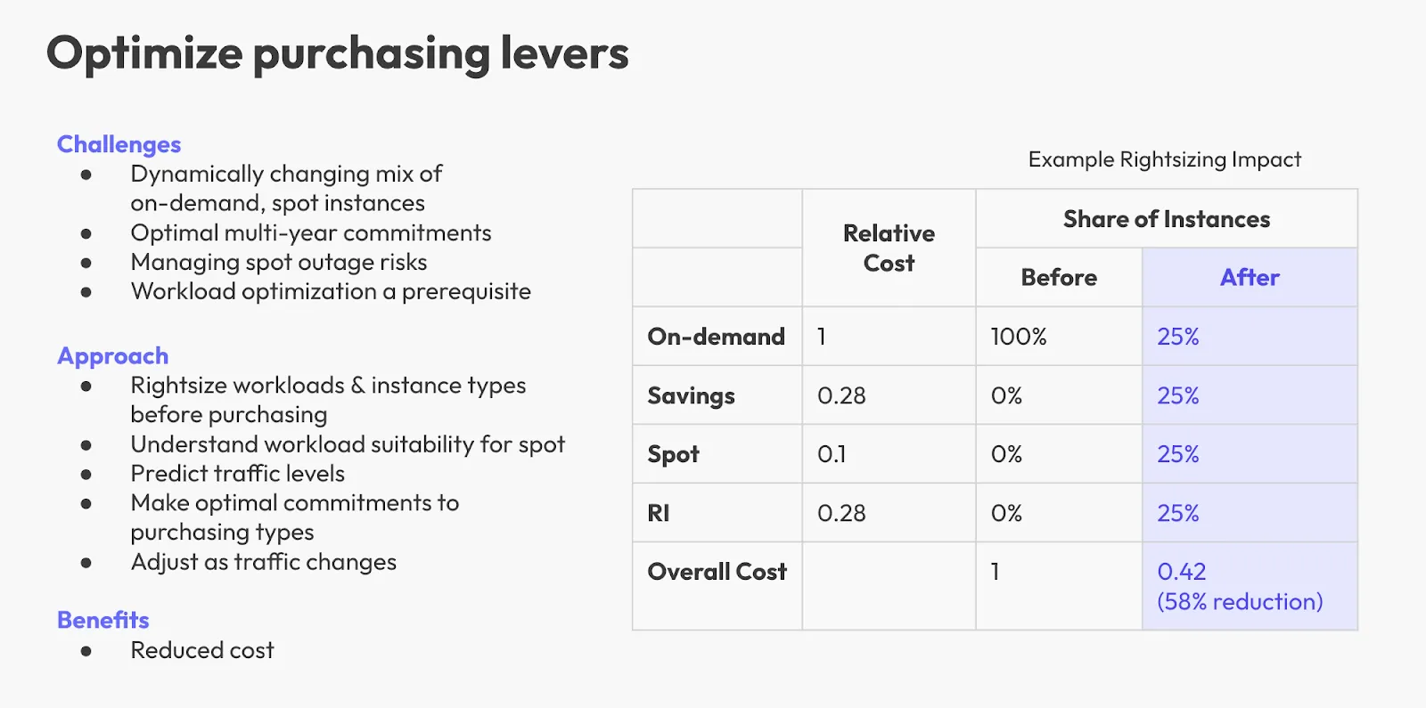 In a very rough scenario of a mix of on-demand, spot, Reserved Instances, and Savings Plans in equal shares at maximum discount levels, you could achieve a 50% reduction in the overall cost.